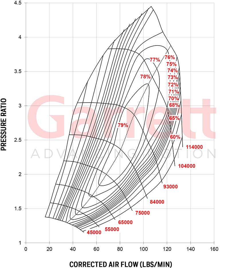 Das komplett neu designte Turbinenrad aus dem Hochleistungswerkstoff Inconel ermöglicht Abgastemperaturen von bis zu 950°C. Der Durchfluss konnte auch hier um bis zu 10% gegenüber den GTX42 Turboladern gesteigert werden. Und das bei einem Wirkungsgrad von bis zu 77%.